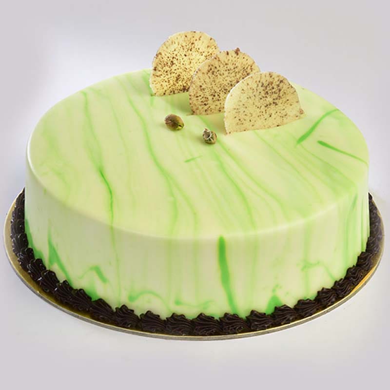 "Pista Truffle Cake: A deliciously smooth treat that combines the best of white chocolate and pistachio flavors."